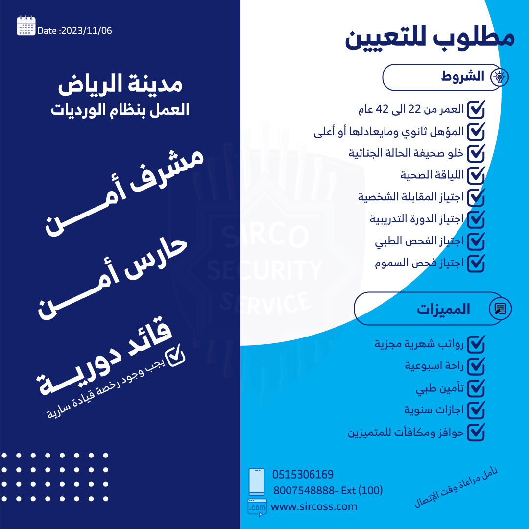 أعلنت الشركة السعودية العالمية للخدمات الأمنية (سيركو) فتح باب التوظيف للوظائف الأمنية بمدينة الرياض، وذلك وفقاً للتفاصيل الموضحة أدناه.